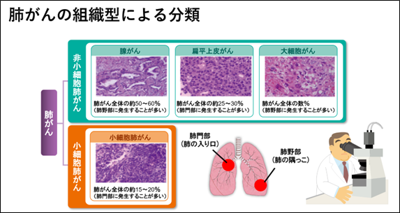 肺がんといっても、実はいくつかのタイプがあり、それぞれ性質や治療法が異なります。気管支鏡検査などで肺がんの一部を採取(生検といいます)して顕微鏡で観察し、がん細胞の形や特徴からタイプを分類します。これを「組織型(そしきけい)」分類といいます。組織型を調べることは、病理検査といわれ、どの治療が最も効果的かを判断するうえで欠かせない、とても大切な検査です。肺がんは大きく分けて、非小細胞肺がんと小細胞肺がんの2つの組織型に大別されます(下図)。