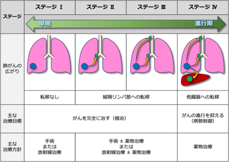 一般的に、ステージT〜Vは根治を目指す治療が行われます。一方で、ステージWでは根治ではなく、「がんの進行を抑えて今の生活をできるだけ長く続けること」が目標となります。近年は新しい薬の登場により、ステージWであっても、長く安定した生活を続けられる患者さんが増えてきています。以下に、肺がんのステージと一般的な治療方針を示します。