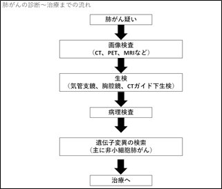 肺がんが疑われてから、治療までの検査の流れを下図に示します。それぞれの検査の目的を以下の4つに分けて解説します。