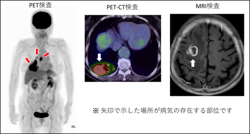 肺がんのステージは、主に画像検査で調べます。全身を評価するためには、レントゲンやCTだけでなく、現在ではPET検査(PET-CT)を用いることが主流です(下図)。糖尿病のある患者さんではPET検査で正確に評価できないため、骨シンチ検査で代用します。また肺がんはしばしば脳に転移するため、脳転移の有無を調べるためにはMRI検査が重要です。